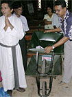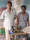 Reverend Fernando and Hasantha Hewahasanji distribute wheel barrows to building supply shop.